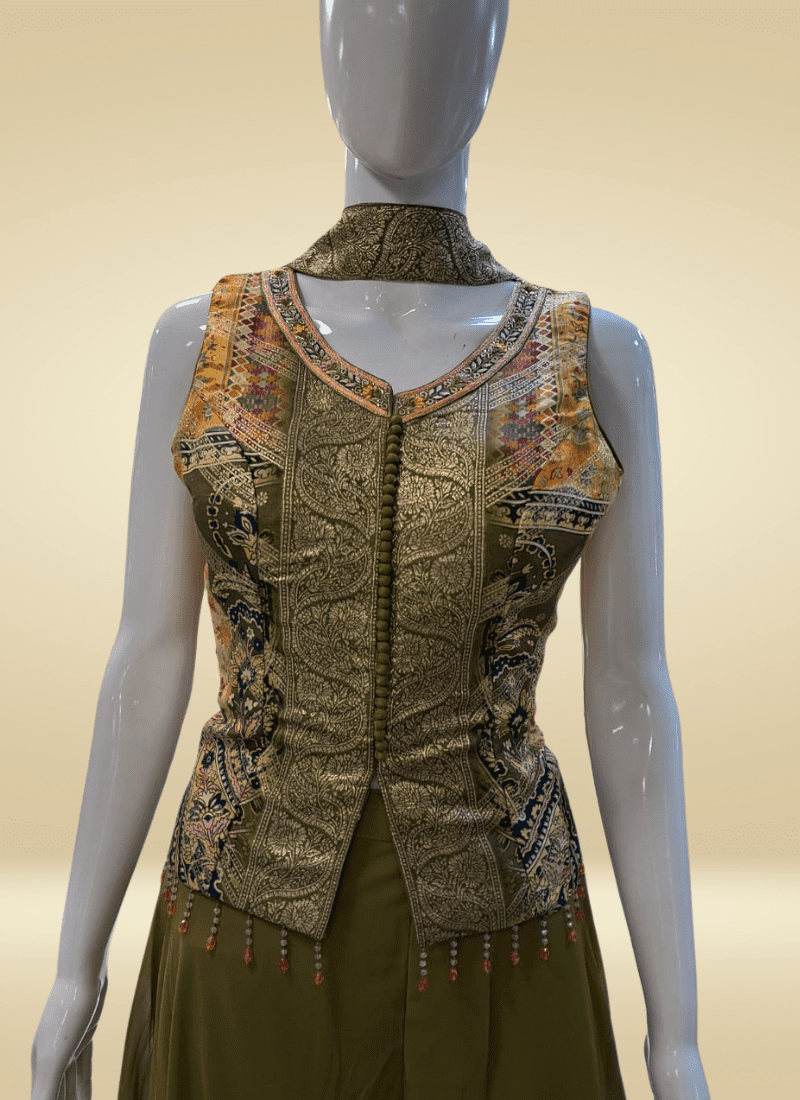Celebrate the spirit of bohemian ease with the Boho Olive Chic Crop Top Palazzo set, a fusion of laid-back charm and ethnic artistry. The crop top showcases a relaxed fit with soft, earthy olive tones enhanced by subtle boho-inspired prints or embroidery, evoking natural beauty and effortless grace.