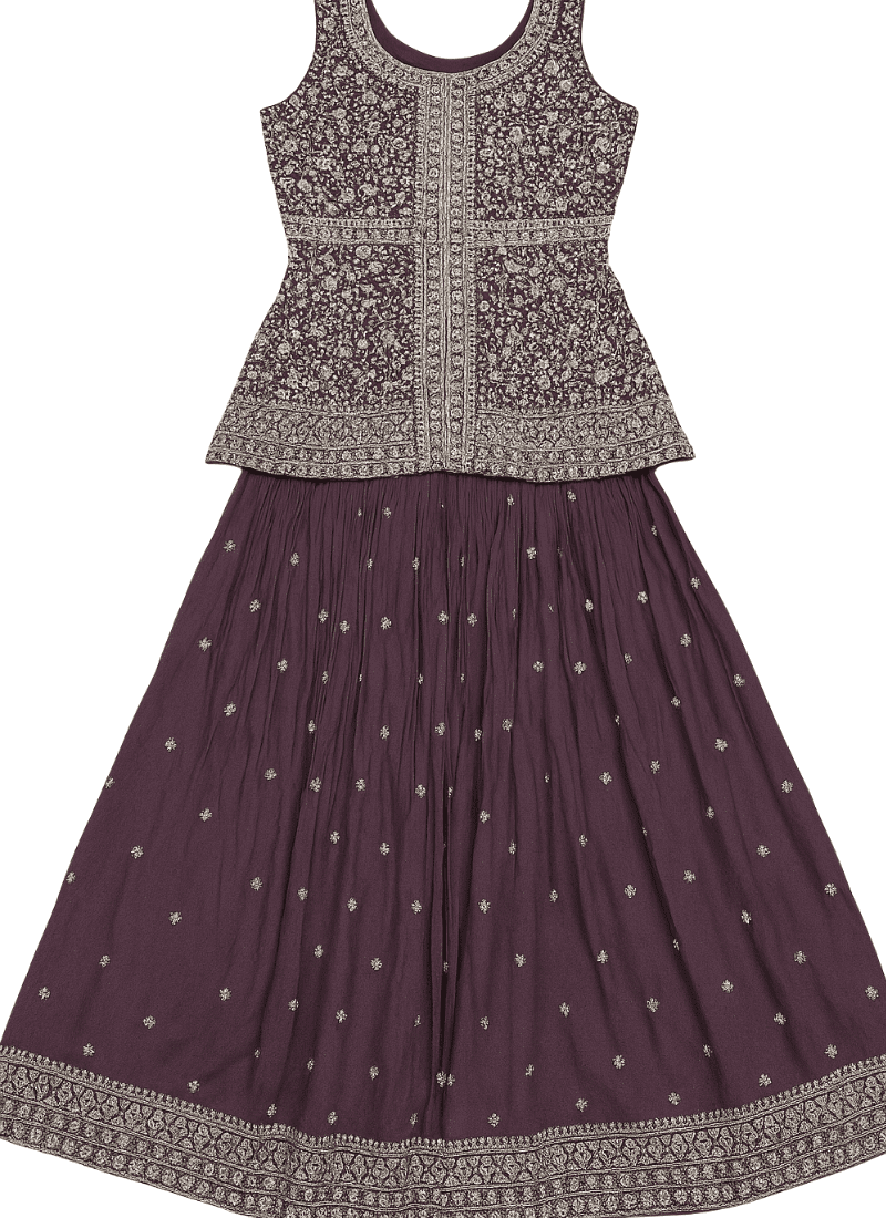 The structured silhouette features a modern jacket-style bodice paired with a flared skirt or tailored trousers (customizable), adorned with subtle metallic embroidery and artisanal touches. Rich yet understated, the outfit exudes charm fit for modern-day maharanis and style-forward gentlemen alike.