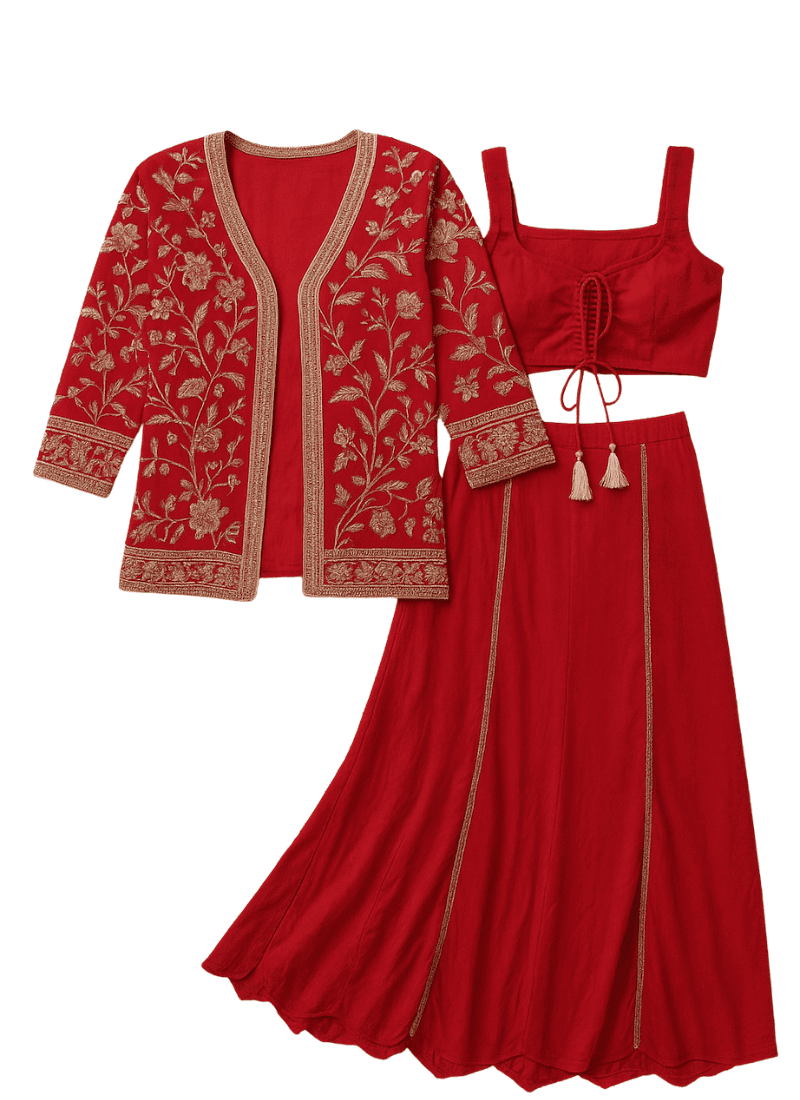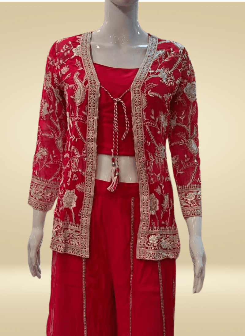 Paired with flowing, high-waisted palazzos, the ensemble brings fluid movement and understated glamour, making it ideal for festive evenings, cocktail celebrations, or pre-wedding events. Available in jewel tones like deep wine, midnight blue, or antique gold, this set is designed to turn heads with poise, not flash.