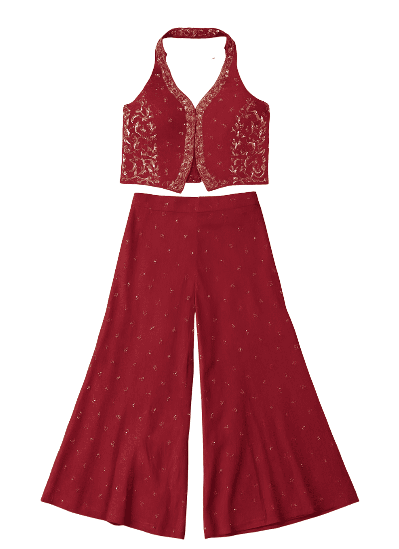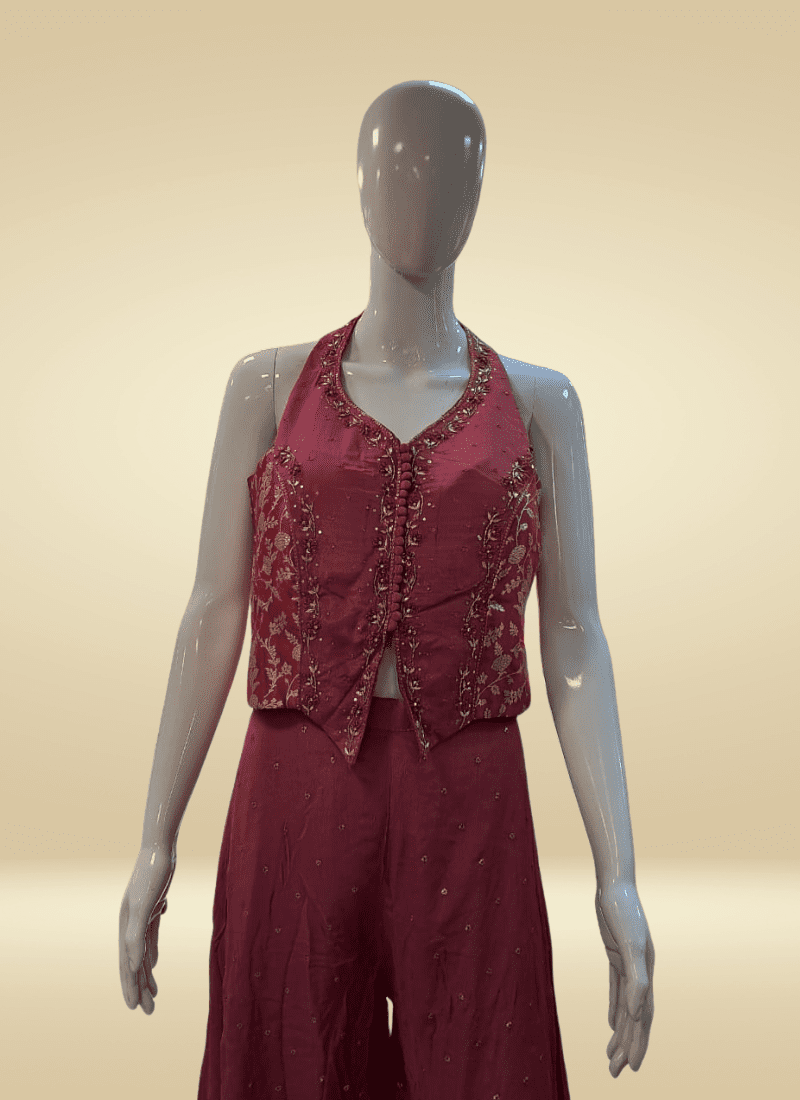 Step into the spotlight with the Gulzaar Maroon Crop Top with Palazzo, an ensemble that embodies regal elegance and modern sophistication. The rich maroon crop top is adorned with exquisite embroidery or subtle embellishments that add depth and texture without overpowering the look.