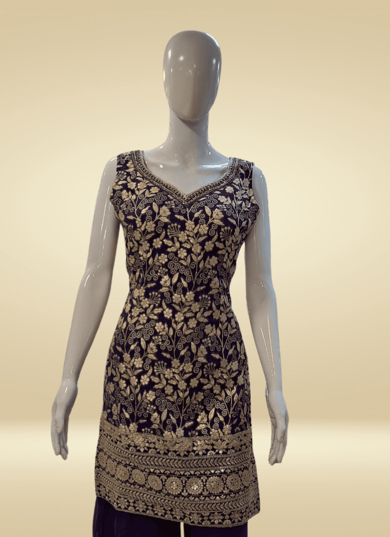 Unveil your inner mystique with the Midnight Bloom Embroidered Sharara—a captivating ensemble where rich, inky tones meet the softness of floral artistry. The kurta features finely embroidered motifs that bloom like moonlit petals against a dark canvas, creating a romantic yet regal statement.