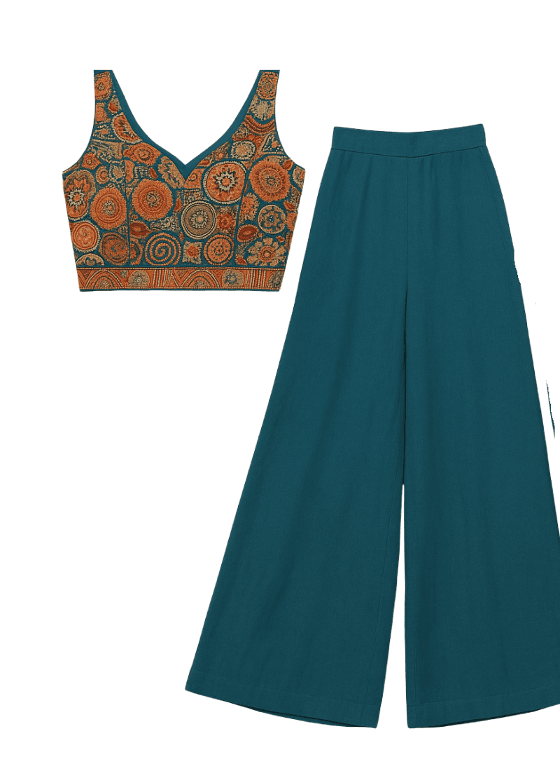 Celebrate eclectic style with the Teal Boho Fusion Crop Top Palazzo, where vivid teal hues meet free-spirited boho prints and contemporary cuts. The crop top features relaxed tailoring adorned with artistic patterns inspired by global bohemian aesthetics, offering a fresh and playful look.