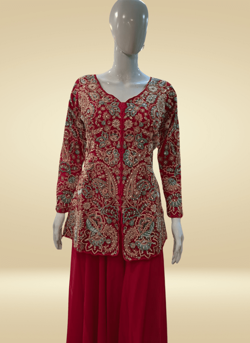 The ensemble is paired with a beautifully flared sharara, offering dramatic movement and structure while maintaining fluid grace. The richness of the fabric, paired with artisanal detailing, makes this set a perfect pick for festive evenings, winter weddings, or elegant cultural soirées.